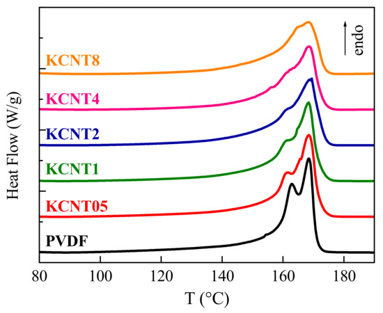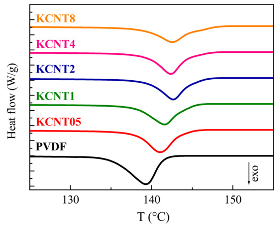 Figure 9 shows the effect of the addition of CNT to the crystallization process of the PVDF. A clear nucleating effect is seen due to the presence of CNT. Accordingly, Tc is moved to higher temperatures than that for the neat PVDF. The location of Tc is shifted 2 °C as a very small amount is added in the KCNT05 material. At higher contents, the displacement increases slightly, reaching a plateau value for the higher contents, as reported in Table 1.