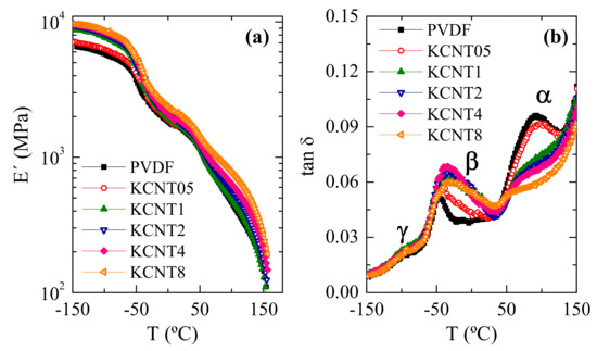 Figure 10 shows the results attained from the dynamic mechanical thermal analysis related to the variation of the storage modulus (E′) and tan δ for the pristine PVDF and the distinct nanocomposites in a broad temperature interval, ranging from −150 to 150 °C. A dependence of the E′ upon the CNT content is noted in Figure 10a. This parameter provides us with an idea about the stiffness of these materials, and the values at 25 °C are the following: 1570, 1620, 1640 1690 1745 and 1940 MPa for PVDF, KCNT05, KCNT1, KCNT2, KCNT4, and KCNT8, respectively. They show a rather linear dependence of the CNT content, which confirms the good dispersion of the CNT within the several materials. The increase of rigidity with the CNT content observed in these nanocomposites is in agreement with the facts found previously in literature for PVDF with CNT [59] and with other fillers, such as Cu nanoparticles [49].