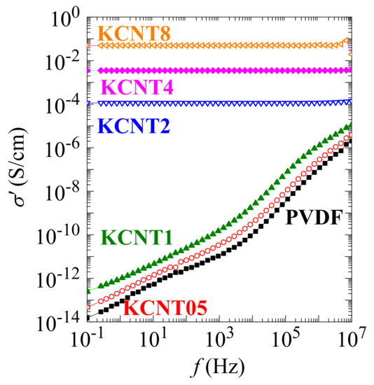 Electrical conductivity (σ′) measured at 25 °C as a function of frequency for the neat PVDF and the different KCNT nanocomposites with distinct contents in CNT.