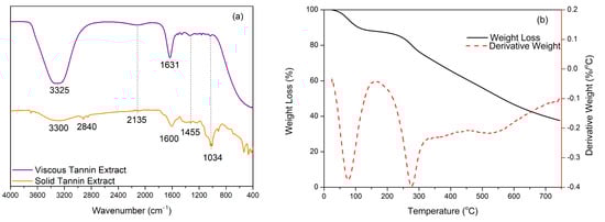 32]. Around 25% weight loss occurred at 311.6 °C, while, at 562.2 °C, a 50% weight loss occurred due to the decomposition of the aromatic rings and it had a decomposition peak at 744.4 °C with a residue level of 37.6%. The stability of the tannins produced in this study was better when compared to tannins from pomegranate barks, which began to decompose at 149.0 °C with a residue level of 36.4%. This could be due to the more significant amount of carbohydrate content in pomegranate bark extract, mainly due to the presence of sugar in the resulting tannin structure, so that the tannin from mangium bark is more thermally stable with a residue level of 37.6% [
