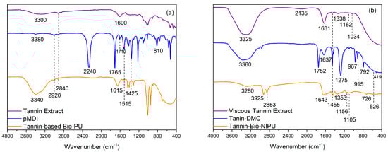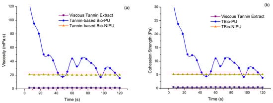 Figure 5a) differed. This was due to a more complex bonding interaction in tannin-based Bio-NIPU and tannin-based Bio-PU compared to tannins due to using other mixed materials when synthesizing the two resins. The higher viscosity value of the tannin-based Bio-PU resin compared to tannin-based Bio-NIPU was due to the use of pMDI in tannin-based Bio-PU, which had a reasonably high viscosity.
