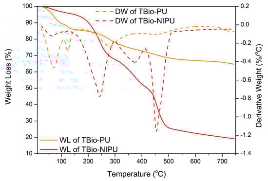 On the other hand, for the tannin-based Bio-NIPU resin, the initial weight loss occurred at a temperature of 201.1 °C; this temperature was higher than that of the tannin-based Bio-PU resin, which was due to the process of evaporation of water and the chemicals contained therein, which did not form bonds intensely during the polymerization process [