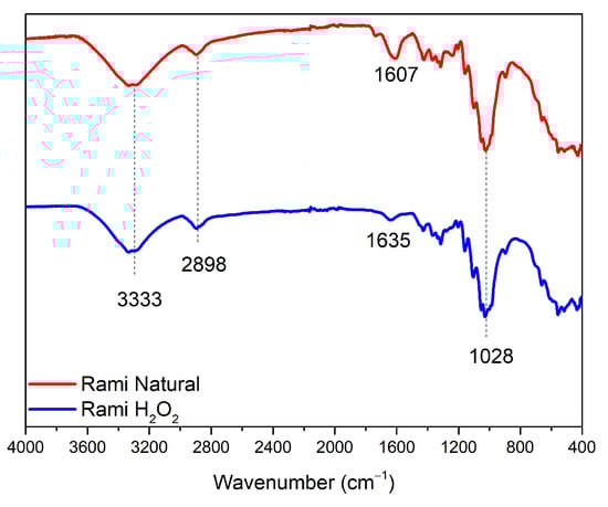 Figure 7), it can be confirmed that there was no significant difference between the two types of fibers. The result illustrates that the softening process did not significantly change the fiber content. Some of the absorption bands that appeared are the vibrational strain of the hydroxyl group (3333 cm