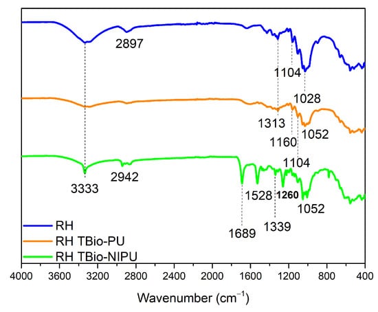 Figure 9 shows the FTIR spectrum of ramie pre-treated (RH) before finally being impregnated with tannin-based Bio-PU and tannin-based Bio-NIPU resins. There were absorption peaks that appeared as in RN tannin-based Bio-PU and RN tannin-based Bio-NIPU, such as at 2942 cm