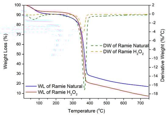 Figure 11). Fiber decreased by 25–50% in RN, which occurred at a temperature of 345.0–367.5 °C, and RH at a temperature of 343.7–359.2 °C, due to the degradation process of chemical components in the ramie fiber, in the form of lignin, cellulose, and hemicellulose. Lignin begins to degrade at 280.0–500.0 °C, cellulose glycosidic bonds decompose at 300.0–400.0 °C, and hemicellulose, the chemical component most easily degraded by heat, degrades at 200.0–290.0 °C [