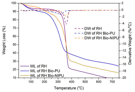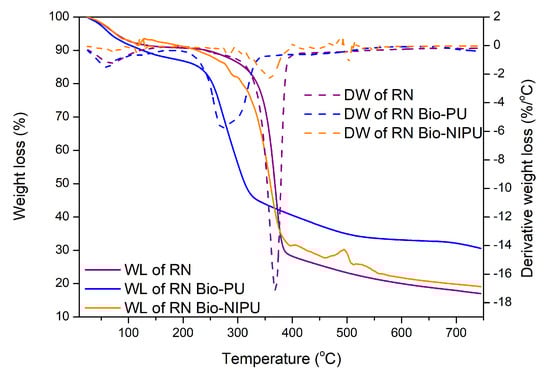 Figure 13). Two reaction processes occurred based on the formed thermogram peaks. The initial stage at a temperature of 60–110 °C was associated with evaporating the water contained in the fiber, with an average decrease of 2.0%/°C. Extreme peaks marked the following process due to the degradation of large molecules, namely the chemical content in the fiber, which is a lignocellulosic group at temperatures above 300.0 °C. In RN fiber after impregnation, there was a weight loss of 50.0% starting from a temperature of 313.1–359.5 °C, while, in RH, it occurred after impregnation at 329.8–359.7 °C. However, when viewed from the perspective of the temperature, RH underwent a degradation process at a higher temperature than RN. Meanwhile, when viewed from the result of total weight loss at the end of the heating process, RN generally has a smaller weight loss when compared to RH. RN impregnated with tannin-based Bio-PU resin experienced a total weight loss of 69.4% (30.5% residue), while RN-Bio-NIPU had a total weight loss of 80.9% with a residue of 19.1% (