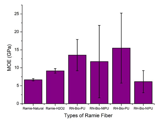 Figure 14); the inverse effects arise because the resin application process is used for non-elastic ramie materials, and thermosetting resins also cause the MOE of the ramies to decrease. However, it is still higher than for the non-impregnated ramies.