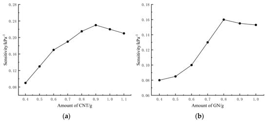 The protocol for testing CNT-GN/RTV polymer nanocomposites was developed using a central composite design (CCD). The effects of four factors—CNT content, GN content, mixing time, and curing temperature—on the flexible sensors were investigated on a single-factor basis, and the sensitivity and compression modulus were chosen as the response values, where sensitivity was used as the main response value for the single-factor experimental design, as shown in Figure 1. The four independent variables were converted to dimensionless variables (A, B, C, and D) with coded values of −2, −1, 0, +1, and +2. The coding levels are shown in Table 1. Factor A is 0.7, 0.8, 0.9, 1.0, and 1.1 g; factor B is 0.6, 0.7, 0.8, 0.9, and 1.0 g; factor C is 10, 15, 20, 25, and 30 min; and factor D is 40, 60, 80, 100, and 120 °C.