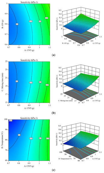In line with the suggested model, three-dimensional response surfaces and contour plots were generated to analyze the interactions between the effects of CNT content, GN content, mixing time, and curing temperature on sensitivity. As demonstrated in Figure 4a, the amounts of CNT and GN had a substantial effect on the enhancement of sensitivity. This may be a result of the large specific surface areas of CNT and GN, which enable each CNT molecule to adsorb two GN molecules to form a three-dimensional mesh structure [26], thereby increasing the contact area with the RTV substrate. At the same time, the synergistic effect of the two increases filler dispersion and prevents conductivity loss from agglomeration. Figure 4b,d demonstrates that the improvement in sensitivity with increased mixing time at a given CNT or GN concentration was not significant; rather, an overly long mixing time may result in a decrease in sensitivity. This may be due to the fact that prolonged shear mixing [27] impedes the formation of the “network” and destroys the “bridge” between CNT and GN. For the improvement of sensitivity, a suitable mixing period is essential. Figure 4c,e demonstrates that the softening of the substrate during the high-temperature curing process led to a decrease in the distance between CNT and GN [28], which promotes the synergistic action of the mixed fillers. The nanofillers are, likewise, more readily aligned in the loading application-favorable orientation, but the reduction in interfacial quality, caused by the differing thermal expansion coefficients of the two fillers, reduces the sensitivity.
