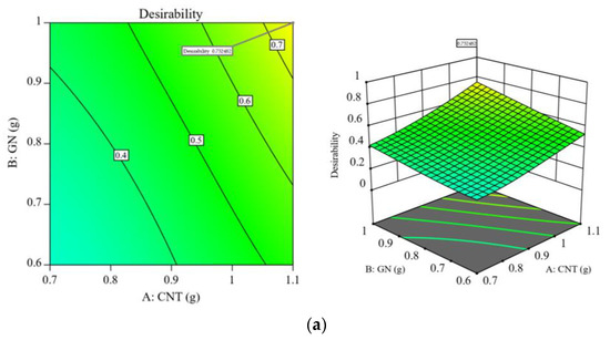 Figure 7a,b displays the total expectation functions of the sensitivity and compression modulus when they are applied simultaneously to comment responses. The best overall expected value of 75.2% was reached at this point, as shown in Figure 8, when the CNT and GN contents were 1.1 g and 1.0 g, respectively, with a mixing period of 15 min and a curing temperature of 68.6 °C. As shown in Table 5, the taken total starting expectation and response expectation values tended to be close to the optimal conditions. This indicates that the CNT/GN-RTV composites were well-optimized. The improved CNT/GN-RTV composite may, therefore, accomplish a sensitivity of 0.385 kPa−1 and a compressive modulus of 601.567 kPa under these circumstances.