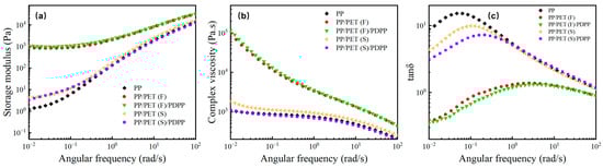 The rheological property of polymer composite has a significant effect on foaming behavior [36]. Figure 3 illustrates the relationship between storage modulus (G′), complex viscosity (η*) and loss tangent (tan δ) with frequency (ω). As can be seen from Figure 3a that the INF composites displayed an increment of G′ at the whole frequency and a plateau occurred at low frequency. Remarkably, the slope of G′ curve for INF composites were about 1 at low frequencies region, which is smaller than that of pure PP and melt-blended composites. The shift of G′ can be attributed to the inhibition effect owing to the presence of PET nanofibrillar physical network and increased entanglements between PET nanofibrils and PP molecular chains [37,38]. Furthermore, for comparison, the viscoelasticity of PP/PDPP composite was also carried out to determine the effect of PDPP particles on viscoelasticity of PP matrix (Figure S1). It was found that the viscoelasticity of PP matrix decreased after adding PDPP individually due to the plasticization effect [33], which can impair the PP’s microcellular foamability. However, G′ of PP/PET(F)/PDPP is slightly higher than that of PP/PET(F) due to the higher length-diameter ratio of PET nanofibrils, which further increases the PP molecular chain’s entanglement. This result is in good agreement with the results of phase morphology discussed before. Figure 3b illustrates that both INF composites presented similar typical non-Newtonian fluid behaviors and more obvious shear shinning effect than that of other samples. η* of INF composites is significantly higher than that of pure PP and melt-blended composites, particularly in the low frequency region. It can be explained that the PET fibril network can restrict the motion of PP molecular chains as a role of a skeleton within PP matrix [36]. It is noteworthy that the η* of PP/PET(S) composite decreased greatly after the introduction of PDPP particles, while the η* is almost kept constant for both INF composites. This demonstrates that the formation of PET fibril network can effectively compensate the negative effect of PDPP on the viscosity of PP matrix.