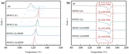 Owing to the state of the crystals in semi-crystalline polymer significantly affects the microcellular foaming process, it is necessary to test the crystallization properties of composites. The melting and cooling DSC curves of various pp matrix composites are shown in Figure 4. It can be observed from Figure 4a that the initial crystallization peak temperatures (Tc) of all PP-based composites were much higher than that of pure PP due to the nucleation effect of heterogeneous crystallization. The free energy barrier was lowered, and the crystal nucleus are easily formed [40]. Furthermore, each INF composite have higher Tc than that of the corresponding melt-blended sample. It reveals that the PET nanofibrils can promote the crystallization rate of PP matrix sharply due to its large specific surface areas, which can act as heterogeneous crystal-nucleating agents [41]. After the introduction of PDPP, Tc shifted to low temperature, and even as low as the pure PP for PP/PDPP blend (Figure S2). This can be explained from the PDPP’s plasticization effect. PDPP particles are inserted into PP molecular chains which weakens the interaction force among molecular chains, resulting in promoting the mobility of PP molecular chains and subsequently decreasing the Tc [33].