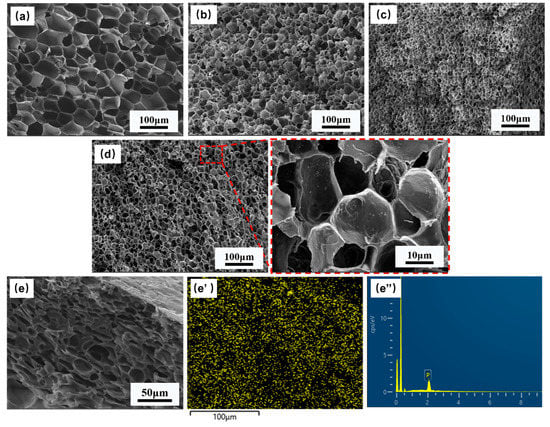Cell morphology of different foams and dispersion mechanism of PDPP: (a) neat PP; (b) PP/PET(S); (c) PP/PET(F); (d,e) PP/PET(F)/PDPP; (e’) EDS mapping of P element; (e”) EDS spectrum.