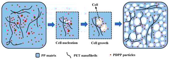To explore the effect of PET fibrils and PDPP particles on the microcellular foaming behavior of PP matrix, the cellular morphologies of the pure PP and PP-based composite foams were observed. Since the incorporation of PDPP particles can lead to very low melt viscoelasticity and Tc value (Figures S1 and S2), the PP/PDPP and PP/PET(S)/PDPP foams show very low expansion ratio (<2.0) and seriously deteriorated cell structures with cell collapse (Figure S4).