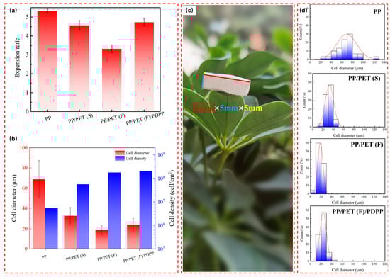 (a) Expansion ratio; (b) average cell diameter and cell density; (c) photograph of PP/PET(F)/PDPP foam placed on plant leave, and (d) cell size distribution of neat PP, PP/PET(F) and PP/PET(F)/PDPP foams.
