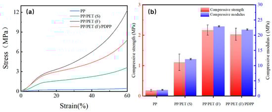 (a) Compressive stress–strain curves, and (b) compressive strength and compressive modulus, for pure PP, PP/PET(S), PP/PET(F) and PP/PET(F)/PDPP foams.