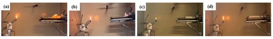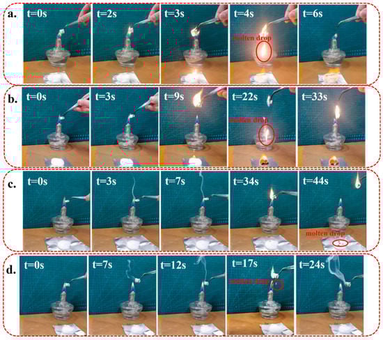 The snapshots of combustion behavior of (a) PP, (b) PP/PET(F), (c) PP/PET(S)/PDPP, and (d) PP/PET(F)/PDPP foams.