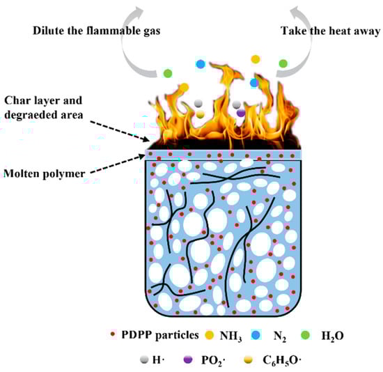 The flame-retardant mechanism of PP/PET(F)/PDPP foam is also shown in Figure 11. The synergistic flame-retardant effect of PDPP particles and PET nanofibrils and the generation of a compact carbon-containing char layer on the surface could prevent the transfer of combustible volatiles from the matrix to the flame, thereby protecting the foams from burning [55,56]. Firstly, it is well known that the scCO2 foaming process is efficient for the uniform dispersion of PDPP particles due to the gas-like diffusivity of scCO2 [57], which can obtain favorable flame-retardant performance. During the combustion process, PDPP particles on the cell surface are decomposed into phosphoric acid, metaphosphate and polyphosphate, which have strong dehydration characteristics [32]. The pyrolysis of PDPP is recognized as an endothermic process, and some non-flammable gases, such as ammonia, nitrogen, and water vapor can dilute the concentration of combustible gases and take away most of the heat [32,33]. That is why the PDPP particles can play an important role in the flame retardation of gas phase during combustion. Additionally, PDPP particles can release HPO, PO2·, C6H4O, which can combine with H· and HO· free radicals known as the main reactants in the thermal oxidation chain reaction, and finally inhibiting the combustion reactions of polymers in the gas phase [58]. Finally, the melt strength of PP matrix was greatly improved by PET nanofibrils, which resulted in a significant reduction of flameless droplets in water samples during combustion [59]. These gathered results indicate that INF composite foams with PDPP particles have much better flame retardancy than pure PP and other PP-based composite foams for thermal insulation.