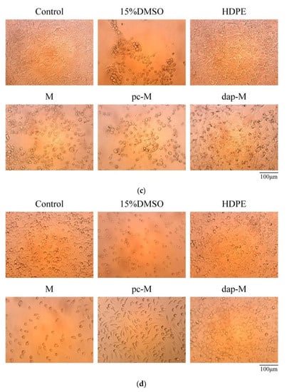 According to the ISO 10993-5 regulation, cell viability maintained above 70% compared with the control group indicates no cytotoxicity, and values between 50–70% and 30–50% indicate slight and mild reactivity, respectively []. As shown in Figure 1a, the cell viability of the unmodified microspheres (Ms) against NIH-3T3 was only 14%, indicating that they had obvious cytotoxicity to the tested NIH-3T3 cells. The phosphatidylcholine-modified microspheres (pc-Ms) showed a cell survival rate of 47%, while the cell viability of DAP-modified microspheres (dap-Ms) improved, reaching 83% non-toxicity. The viability of L929 cells also showed the same trend (Figure 1b), and the value in the dap-M group reached as high as 106%, confirming that DAP instead of PC can greatly improve the biocompatibility of post-crosslinked microspheres. The cell morphology of the NIH-3T3 and L929 cultures in the pc-M group extracts was dead spheres, while the DAP-modified cells showed a good spindle shape, confirming that the cytotoxicity of the microspheres can be improved by modifying DAP (Figure 1c,d).
