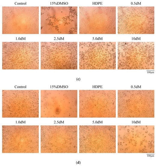 Figure 2 shows the biocompatibility of the crosslinked microspheres modified with different concentrations of DAP. The viability of NIH-3T3 cells in the 0.5 dM, 1.0 dM, 2.5 dM, and 5.0 dM groups exceeded 70%, indicating that all the groups, except for the 10 dM group that had the highest DAP concentration, were not cytotoxic (Figure 2a). Similarly, L929 cells showed the same viability trend (Figure 2b). In the qualitative observation, cells in all groups, except for the 10 dM group, had a good spindle shape (Figure 2c,d).