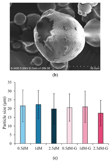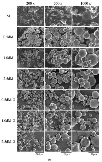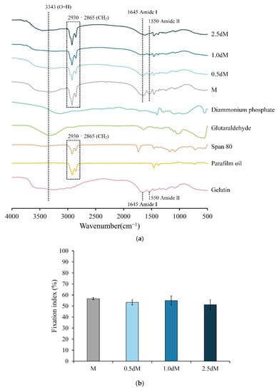As shown in Figure 3a, gelatin has the absorption bands of amide I and amide II at 1550 and 1645 cm−1, respectively. Amide I is the stretching vibrations of C=O and C-N, and amide II is mainly due to the stretching vibrations of C-C and C-N [,,]. Groups M, 0.5 dM, 1 dM, and 2.5 dM have gelatin absorptions of amide I and amide II. Functional groups, including paraffin oil and Span 80, were found in the oil phase residues because microspheres were prepared from W/O emulsions. Therefore, the prepared microspheres have C-H2 absorption at 2865 and 2930 cm−1 bands. In addition, the microspheres and crosslinker glutaraldehyde have an O-H absorption peak at the 3343 cm−1 band. Although gelatin also has O-H absorption, the microspheres could be free of glutaraldehyde residues because of a lack of tendency for an increase in O-H density.