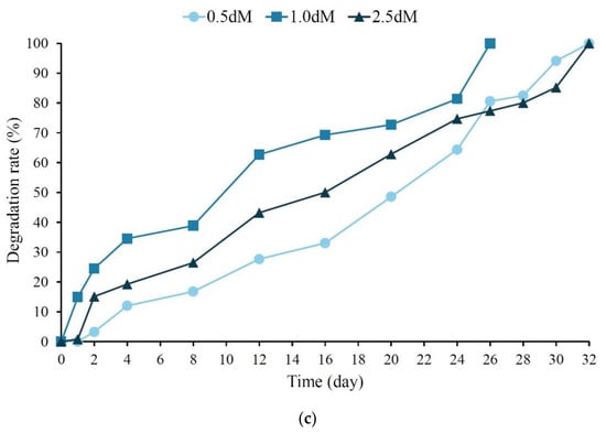 As shown in Figure 3c, 0.5 dM and 2.5 dM were completely degraded within 32 days, while 1.0 dM was degraded within 26 days. During this period, each group of microspheres did not degrade suddenly and rapidly but degraded in a linear manner: 0.5 dM (y = 2.9807x − 4.5438, R2 = 0.9735), 1.0 dM (y = 3.1905x + 13.844, R2 = 0.9434), and 2.5 dM (y = 2.9257x + 3.8528, R2 = 0.9865). From the perspective of linear relationships, no significant difference was found among the three groups. However, the initial minimum degradation rate was 0.5 dM, indicating that the modified microspheres of 0.5 dM exhibited the best resistance to degradation.