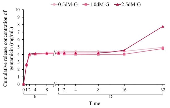 Prolonged drug release was observed in this study, possibly because of freer void spaces available, through which fewer drug molecules will be transported. The cumulative release percentage of 2.5 dM-G was higher than that of 0.5 dM-G and 1.0 dM-G. The increase in DCP in the hydrogel matrix helps to carry large doses of antibiotics, resulting in higher release from gentamicin in the matrix. This secondary release explains that the explicit release behavior of post-crosslinked hydrogel microspheres depends not only on many factors, such as degree of crosslinking, but also drug loading amount and method [].