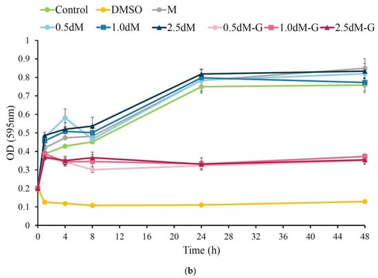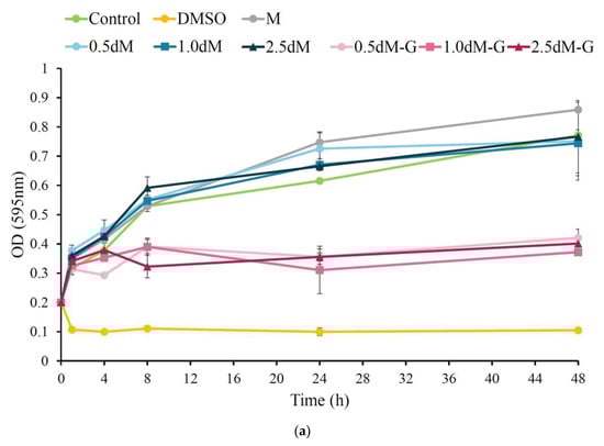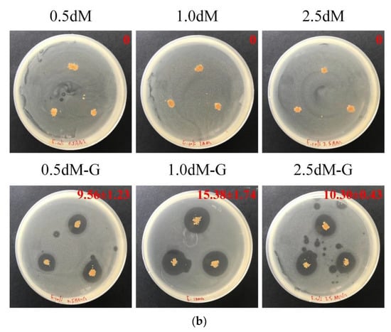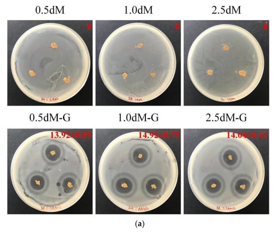 The cumulative antibiotic release of 2.5 dM-G was not significantly higher than that of 0.5 dM-G and 1.0 dM-G until the microspheres showed a significant difference after soaking for 32 days. The release was not significant for a period of time, but the cumulative antibiotic dose was effective for 4–8 h of antibacterial ability, and the release amount maintained a plateau for 16 days. Compared with the degradation of DAP-modified microspheres after soaking, the post-crosslinked hydrogel resulted in less than half of the degradation of the dense network structure (Figure 3c), thereby efficiently decreasing the swelling rate and the drug release rate of the hydrogel microsphere matrix [].