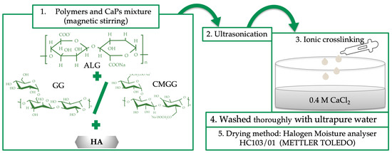 The composite beads (CBs) were obtained by ionic crosslinking of ALG, GG and CMGG with CaCl2, in the presence of HA. Inspired by the composition of the human bone [34], the CBs include 33% wt. organic compounds (biopolymers) and 67% wt. inorganic compounds (HA). The first step was the mixture of the polymers: ALG, GG or CMGG and HA. For a proper homogenization, the mixture was ultrasonicated, 30 s (UP50H homogenizer, Hielscher Ultrasonics, Teltow, Germany, amplitude 100%), then dropwised into a CaCl2 bath (0.4 M) and left to crosslink for 2 h at room temperature. After repeated washing procedures with ultrapure water, the beads were dried using a halogen moisture analyzer (HC103/01, Mettler Toledo, Greifensee, Switzerland), at a drying temperature of 105 °C.