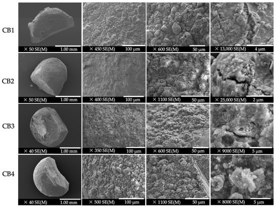 Figure 2 presents the morphology of the synthesized beads and the microstructure of their cross-sections, at a magnification between ×40 and ×50 (for a general view), and at high magnifications (between ×350 and ×25,000) to observe reasonable details that can influence CBs’ features and biological properties.