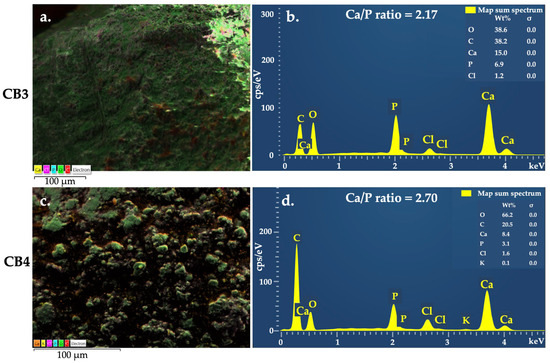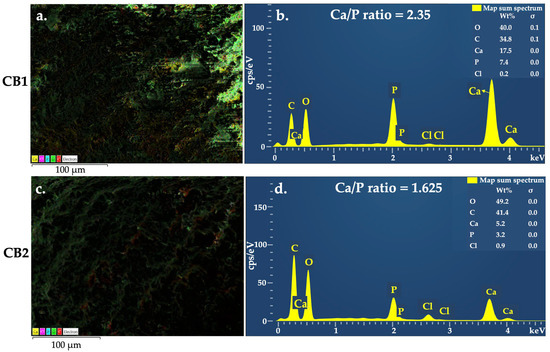 EDX is a valuable microanalysis used in various biomedical fields; with regard to the specimens containing calcium phosphates, it is considered a semi-quantitative method, since it allows the determination of Ca/P molar ratio, indicating the nature of the calcium phosphates located close to the matrix surface [45]. The elemental mapping results of the four CBs (Figure 3a,c, Figure 4a,c and Figure A1, Figure A2, Figure A3 and Figure A4) proved the existence of the expected elements, namely C, O, Ca, P, and Cl, suggesting that HA were uniformly distributed in the polymeric matrix. Table 2 and Figure 3b,d and Figure 4b,d, present the result of the elemental analysis, used to determine the Ca/P ratio.