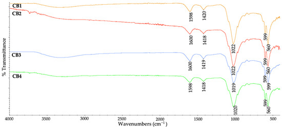 On the ATR–FTIR spectra of the four CBs (Figure 5) the absorption bands specific for the used polysaccharides and the calcium phosphates were identified. The peaks around 1600 cm−1 and 1420 cm−1 are specific to the biopolymers: in the case of ALG representing COO− asymmetric and symmetric stretching [51], while for GG/CMGG indicated the presence of carbonyl groups [52]. Regarding HA, the peaks near 1020 cm−1 can be assigned to the vibrational modes of ν3 PO43–, whereas those at about 600 cm−1 and 560 cm−1 can be attributed to vibrational modes of ν4 PO34– [53].