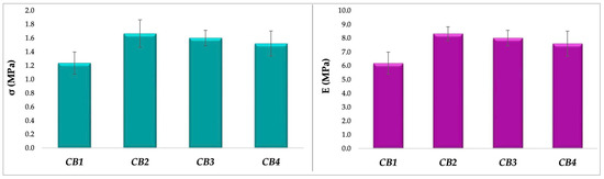 CBs mechanical features: compressive strength—σ (left) and Young’s Modulus—E (right).