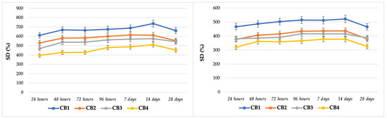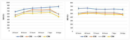 The values attained for SD in DMEM were relatively constant, especially for CB1 and CB2. After seven days of immersion, a slight decrease was noticed for CB2. CB3, and CB4 graphs showed an inconstant behaviour.