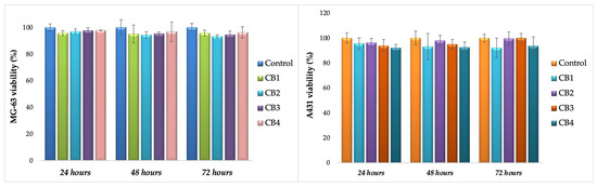 The MTT assay was performed separately on two different cell lines: MG63 human osteosarcoma cells (ATCC, Rockville, MD, USA) and A431 human epidermoid carcinoma cells (Cell Service, Eppelheim, Germany), after the approval of the Ethical Committee of Grigore T. Popa University of Medicine and Pharmacy of Iasi, Romania (no. 141 from 26 January 2022). A standard protocol, already described by our group in another published paper, was used [33]. In brief, Mg-63 and A431 were incubated for 24 h in conditions proper for cell cultures (5% CO2, 37 °C, 95% relative humidity), in complete DMEM enriched with 10% FBS and 1% P/S/N, in plates of 48 wells (10 × 103 cells/well). After a proper sterilization (UV exposure for 2 h, 1 h on each part), the beads were incubated with the already attached cells (direct contact). Considering the size of the beads, and their interaction with DMEM and HBSS, 48 well plates were used and the MTT test was accomplished for four aliquots (1 bead/well, mean weight 3.5 ± 0.3 mg and mean diameter around 1.7 ± 0.1 mm) at 24, 48 and 72 h.