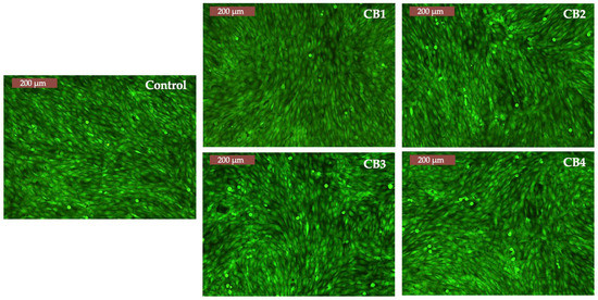 The Calcein-AM assay was carried out after 72 h of direct contact of the beads with MG63 cells, as CBs’ main application is bone tissue engineering. In brief, after removing the beads and the medium from the wells, the cells were washed two times with HBSS with calcium and magnesium. A volume of Calcein-AM solution prepared in HBSS (2:1000) was added in each well to completely cover the cell layer and was maintained for 40 min in incubator, at specific conditions for cell cultures. Inverted Phase Contrast Microscope (Leica, Wetzlar, Germany), 10× objective, was used to study cells morphology and density.