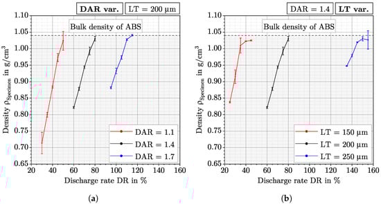 3) is barely or not at all reachable. Not even when the DR is increased to any value within a LT-DAR combination, which is due to the fact that the density curves flatten out and the linear relationship between the density and the DR is lost. Specimens close to the bulk density of ABS also show significant overfilling as shown in