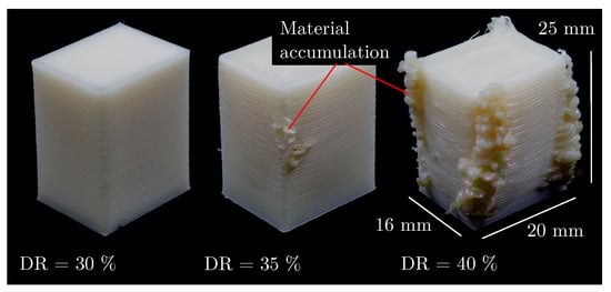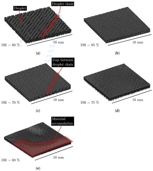 8]. It was concluded that the DAR and LT must be reduced for high density and mechanical properties, but this is not necessarily the case when DR is taken into account. The three parameters LT, DAR, and DR are rather to be seen as a parameter set for controlling the degree of filling or density within a layer and must be adjusted to each other for a desired density. In this case, LT and DAR could remain constant at any level and only by adjusting DR, the same density can be reached compared to a reducing of LT or DAR. In summary, the observation from