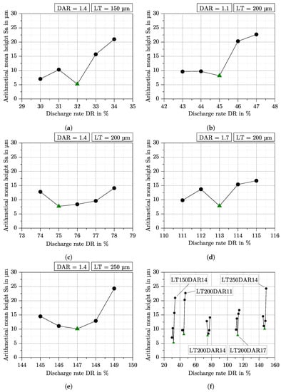 In summary, for each LT-DAR combination, it is possible to determine a unique parameter set for manufacturing a part with optDF. For the investigated combinations used in this work, the DR for optDF can be taken from the green marked points in