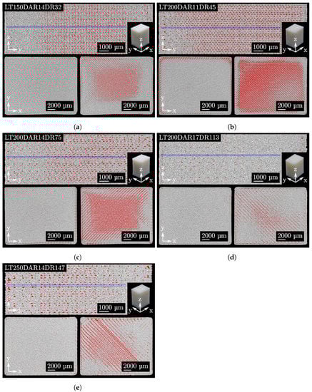 Figure 6, the appearance of the voids for the five parameter sets is visible. It is noticeable that almost no voids occur within a layer for each of the parameter sets. This observation is in good agreement with the expectation of optDF. Upon reaching this state, there are no gaps between the tracks not only on the top of the surface, but also in the inner layers. Only in the transition from perimeter to filling small voids can be found. However, the reason for the different residual porosity depending on the parameter sets can be found between the interfaces of two layers. Depending on the parameters LT and DAR, the shape of the droplet inside a part and the associated void volume seem to be different.