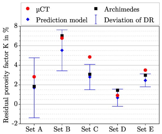 Figure 10 compares the three residual porosity factors determined theoretically and experimentally. The difference between the two experimental methods can be explained as follows: For density measurement, small air bubbles that adhere to the rough surface of the specimen can reduce the density and thus increase the porosity. However, this influence is considered to be small. In the case of porosity determination with µCT, the threshold between material and air influences the size of the porosity. This influence was in the order of ±1%. Despite these method-related errors, the measurements are in good agreement with each other.