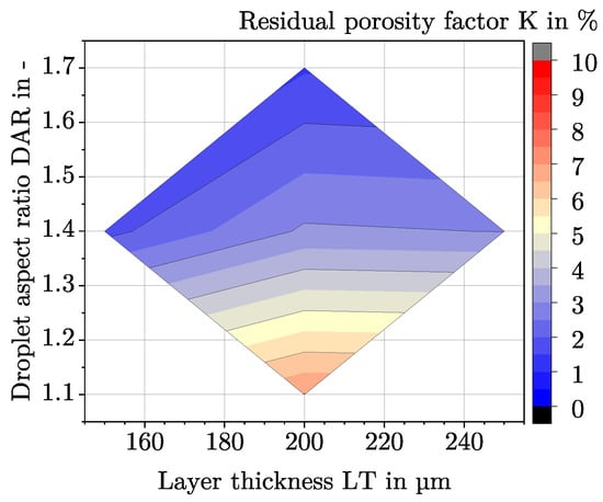 Figure 9, it will approximately form as a sphere. Otherwise, a force acts on the droplet and deforms it. As a result, the same volume spreads in a more adapted way and fills the available space under less void formation. The more a droplet has to deform, the more voids can be compacted. If a ratio is calculated from the droplet length and the LT, and from the droplet width and the track width, the average of these two ratios can be used as a criterion for the deformation of a droplet. The correlation between the “Deformation factor” and the residual porosity from