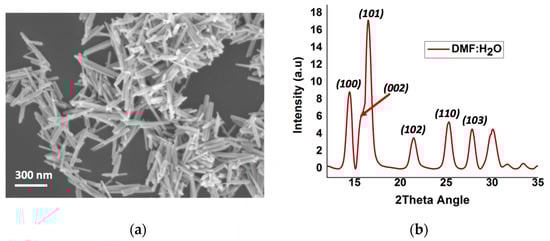 The morphology of the ZnO nanorods prepared in the water/DMF solution, following the previously published sol-gel synthesis method [], exhibited needle like rods average dimensions of a 300 nm length and 30 nm diameter (Figure 1a). The X-ray powder diffraction pattern of the ZnO nanorods shown in Figure 1b were indexed to the hexagonal phase’s wurtzite crystal structure and was in good agreement with that in the published literature [].