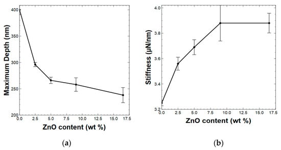 The primary mechanical properties, which include stiffness (S), reduced elastic modulus (Er), and hardness (H), of different weight ratios of ZnO nanorod-reinforced polyamide–imide films were evaluated. As defined by Equations (1)–(3), these three mechanical properties rely on the depth of penetration by the tip of the indenter into the material. For instance, a decrease in the penetration depth at a constant load for composites with an increased filler concentration results in increased stiffness, reduced elastic modulus, and hardness.