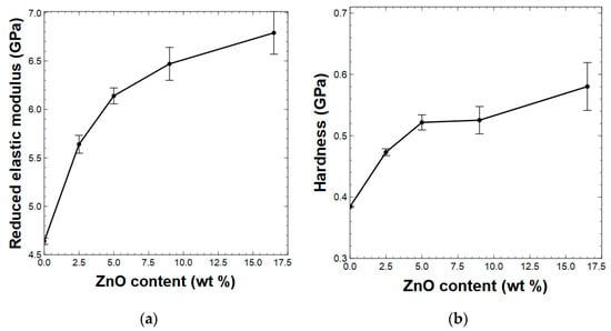 The distribution of (a) reduced elastic modulus, and (b) hardness of composites with a different wt % of ZnO nanorods [standard deviations are marked with vertical black lines].