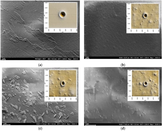 Supporting the SEM images, top-down AFM images and surface roughness profile images of each composite were also obtained after the indentation and are shown in Figure 4 (inset) and Figure S1, respectively. As summarized in Table S2, the surface roughness of each composite film obtained from the AFM depth profile images agrees with the filler concentration and speaks to the surface morphologies revealed from the SEM images and top-down AFM images. With the increase in the filler concentration, there was a significant increase in the surface roughness of the composites, in which the 5 wt % ZnO nanorod-reinforced composite exhibited ~4 nm surface roughness whereas the 9 wt % and 16.5 wt % ZnO nanorod-reinforced composites possessed surface roughness values of ~14 nm, suggesting the favorable balance in interfacial interactions between ZnO nanorods and polymer chains under a low filler concentration vs. the presence of stronger interparticle interactions among ZnO nanorods at a higher filler concentration compared to the presence of particle–polymer chain interactions. Similar findings have been previously reported by many researchers where the aggregative cluster formations were observed at a higher filler concentration of ZnO nanoparticles in different polymer matrices [,,,].