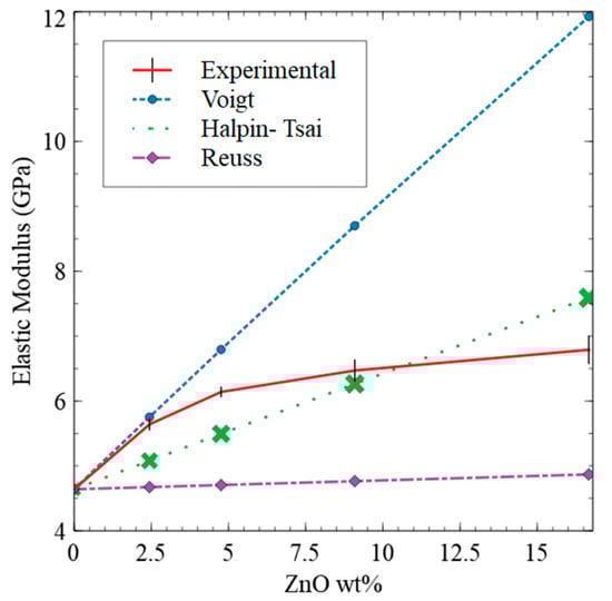 Considering the aspect ratio of the filler in addition to considering the volume fraction of the matrix and the elastic modulus of the filler and matrix, we applied a MROM-Halpin–Tsai model, which is described by the Halpin–Tsai equation (Equation (6)). Unlike the Voigt and Reuss approximations, the Halpin–Tsai one provides a single value for the prediction of elastic modulus, not an upper and lower bound. As depicted in Figure 5, the experimental elastic moduli were higher than the predicted elastic moduli by the Halpin–Tsai model. This could be due to the strong interparticle interactions as a result of the high surface-to-volume ratio of the nanofiller. The Halpin–Tsai model is unable to account for the nanoscale effects of filler and thus underestimates the response of added nanofiller at these concentrations. However, beyond a 9 wt % ZnO nanorod concentration, the Halpin–Tsai model overestimates elastic modulus. Overall, predictions made from ROM models and the MROM model convey that a higher loads of ZnO nanorods have a lesser impact on enhancing the elastic modulus of the composites. This is because the addition of more ZnO can only contribute to load transfer by flow restriction.