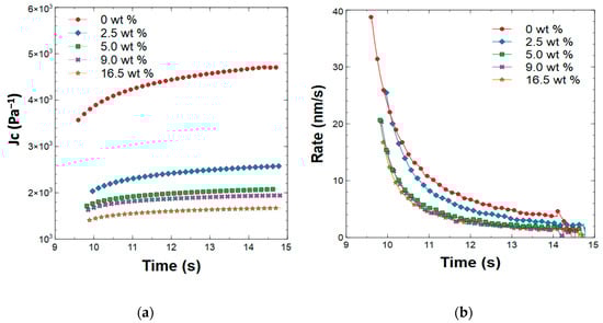 The creep behavior plots as a function of time for (a) displacement (Jc) during 5 s hold under 150 μN load, and (b) rate of displacement during hold.
