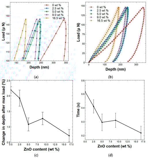 In the pursuit of understanding the delayed viscoelastic response, a nanoindentation experiment with no hold at the maximum load (150 μN) was performed and the load displacement curves are shown in Figure 8a,b. It is noted that neat PAI films, and 2.5 wt % and 5 wt % ZnO nanorod-reinforced composite films, exhibited the continued penetration after the point of maximum load. For the neat PAI films, as stress was applied to the polymer, the weak intermolecular π–π interactions were broken, leading to the movement of the polymer chains. Once the stress started to dissipate, the overall structure of the polymer was still quite weak, as it took time for the intermolecular interactions to recommence. Therefore, polymer chains would have continued to move due to whatever residual stress it still experienced. For the ZnO nanorod-reinforced polymer composites, the ZnO nanorods could both restrict polymer movement as well as absorb some of the stress. Therefore, the composite materials were less susceptible to continued deformation.