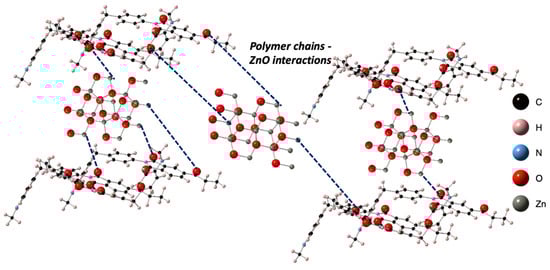 The changes in mechanical properties with respect to the wt % of ZnO nanorod concentration can be explain by considering the possible interfacial interactions between the facets of ZnO nanorods and PAI polymer chains. Typically, the shape and size of nanomaterials contribute to the largest interfacial element surface and the shortest interelement distance when individually dispersed []. Therefore, they can induce the larger area of the surrounding polymer matrix to create polymer–particle interactions, providing clear reinforcement and causing polymer chain mobility retardation []. In our case, the metal cation nodes of the ZnO nanorods non-covalently interacted with the carbonyl functional groups in amide moieties in the PAI chains, creating so-called “bridging chains”, [,,] which interact with multiple ZnO nanorods, yielding nanorods in chain-bound clusters (Figure 10). These clusters could behave as independent entities dispersed in a polymer matrix, creating a hierarchical structure that contributed to the final properties of the composites through element−polymer interfacial interactions and an intra-element nanorod−polymer-bridged nanostructure and provided intrinsic stiffness to the cluster. As stress was applied to the PAI matrix, some of this stress was transferred to these clusters as well as through flow restriction of the PAI by the nano-reinforcement caused by randomly oriented nanorods []. The result of this was that the effective stress on the matrix was only a fraction of the actual stress on the system, and thus it better resisted deformation than the neat polymer films did. Given the ZnO nanorod’s relatively high stiffness, the stress transferred to it by the PAI caused essentially no deformation of the ZnO nanorods.